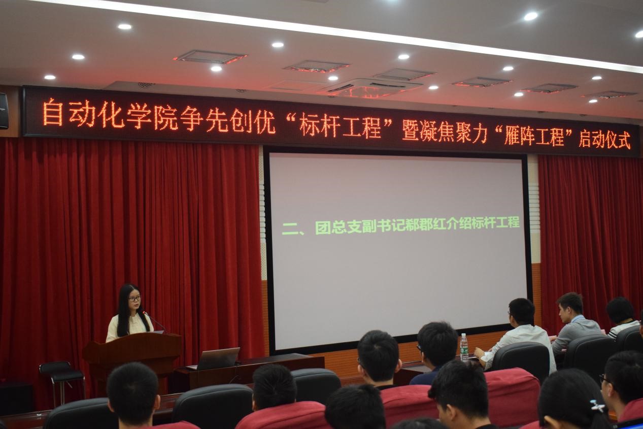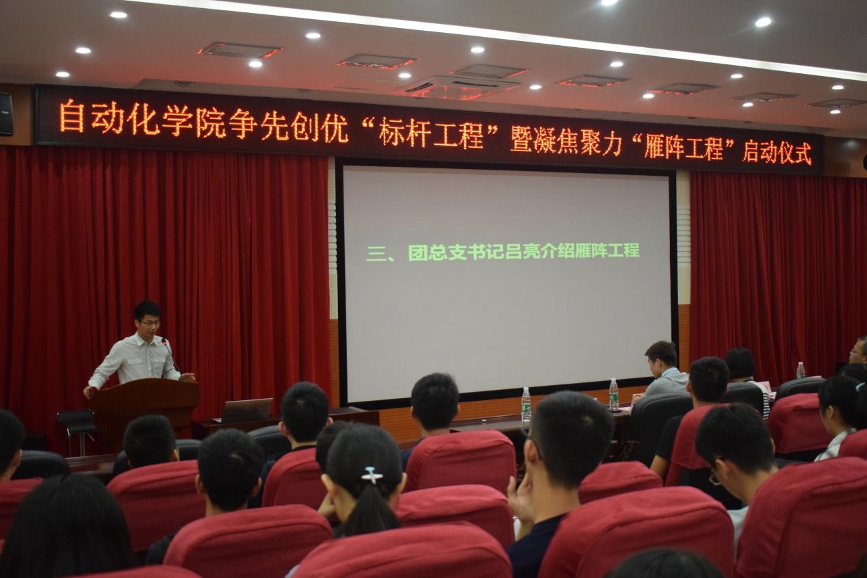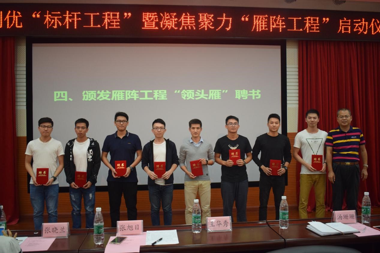 为树立立德树人的教育根本任务,围绕学院人才培养目标,充分发挥教工党员、学生党员、科创标兵和学生干部的模范带头作用,实现“1+1>2”的雁阵效应,威廉希尔williamhill(中国)推出了标杆工程以及雁阵工程项目,并且于2017年10月19日星期四下午2点在白云校区报告厅举办了启动仪式。出席本次会议的有威廉希尔williamhill(中国)党委书记张旭日、党委副书记王华秀、实验室指导老师、辅导员老师们以及学院学生干部、各班学生代表。