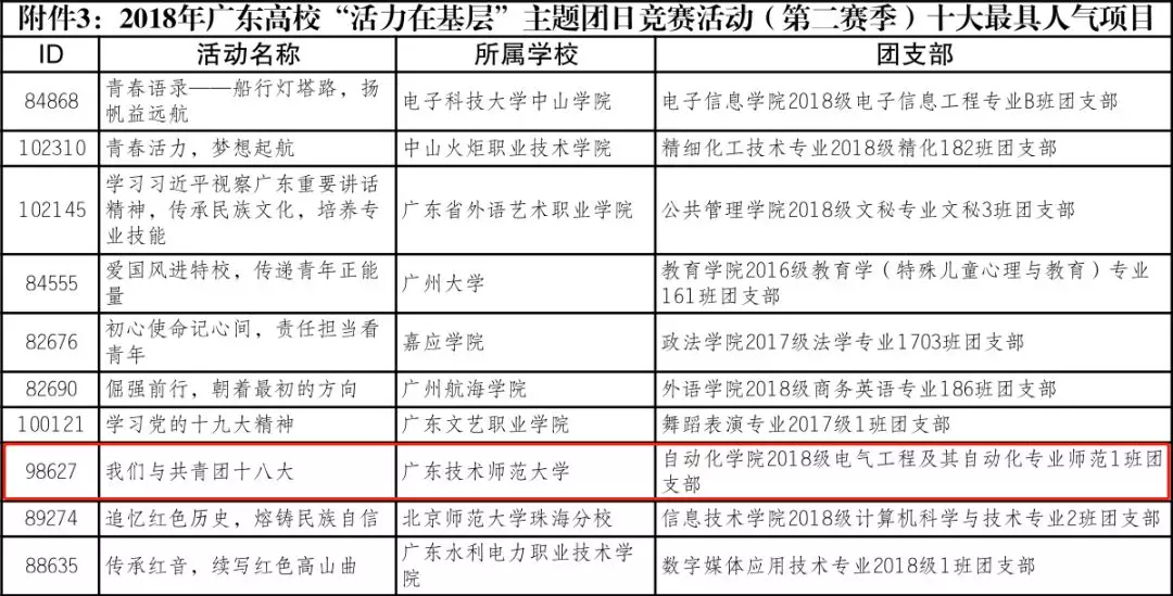 2018年,威廉希尔williamhill(中国)积极响应广东省高校“活力在基层”主题团日竞赛活动,推出多个优秀班级参加竞赛活动,经过学院与学校的推荐及省级遴选,威廉希尔williamhill(中国)2018级电气工程及其自动化师范1班在2018年广东省高校“活力在基层”主题团日竞赛活动(第二季)中荣获“百优”项目奖,并获得十大最具人气项目奖。