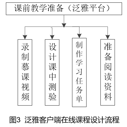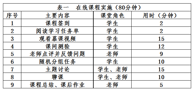 | 四、基于泛雅客户端的在线课堂精心设计方案 基于泛雅客户端的在线课堂设计方案如图3所示。课前准备包括录制慕课视频、设计课中测验、制定学习任务单、准备阅读资料上传至泛雅平台。课中通过播放慕课视频、完成课中测验培养学生紧凑的阅读理解能力,这是面对面教学不能达到的;教师有针对性的实施慕课“聊课”技术,师生之间的协作与交流。有效推进学生的学习进程。课中实施时间计划如表一所示。在面授课堂中,任课教师面对全班学生讲出一句话、一个概念、一种方法,学生即便没听到或者没听懂,也无法让老师停下来,无法让老师再讲一遍。观看“慕课”视频则不同,学生可以在任何一个地方让“老师”停下来,也可以让“老师”再讲一遍或重复多遍,一切等他理解了、明白了,再继续进行。这种改变有利于提升教学效果,提高学生成绩。 |
