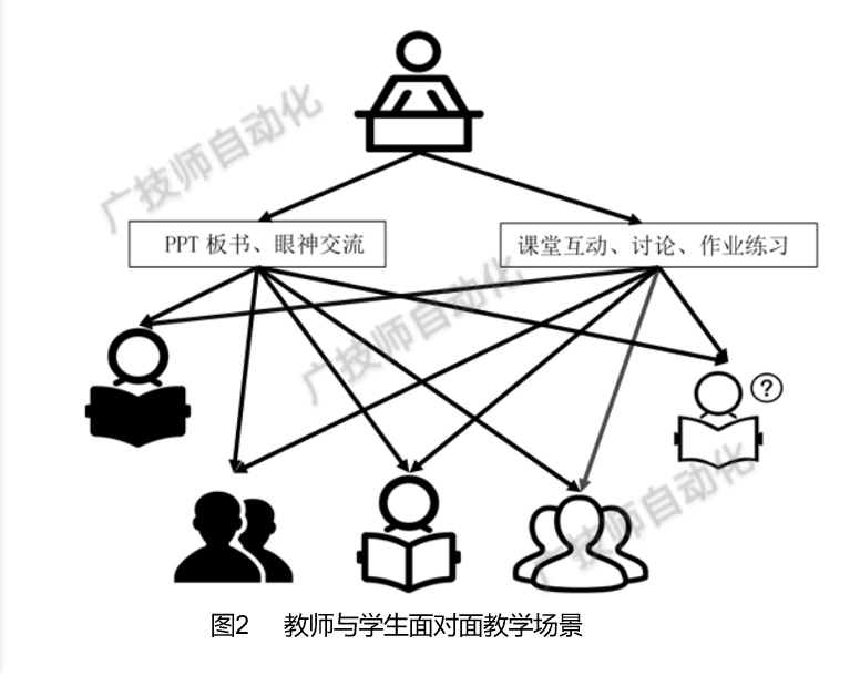 在线授课是课堂教学改革的重要发展方向。组织好教学内容,保障好授课效果,实现师生有效互动,强调学生的主动性和参与性是在线教学设计的重点(如图1所示),可以在一定程度上扭转此前传统面对面课堂以教师为主的教学模式(如图2所示),把更多的学习自主权和时间交给学生,把“控”变为“推”,把“教”变为“学”,把“管”变为“伴”。