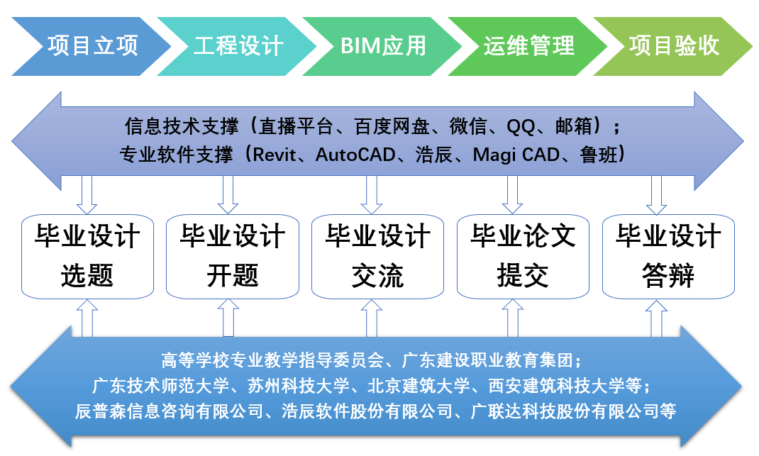 (1)学校专任教师与长期联系的校外企业合作,共同研究企业在实际工程项目实践中遇到的问题,将建筑工程项目的全生命周期过程“项目立项-工程设计-BIM应用-运维管理-项目验收”与毕业设计的实施开展“选题-开题-指导交流-论文提交-答辩验收”各阶段进行有机融合。
