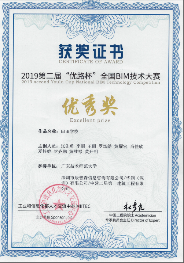 BIM技术大赛优秀奖获奖证书