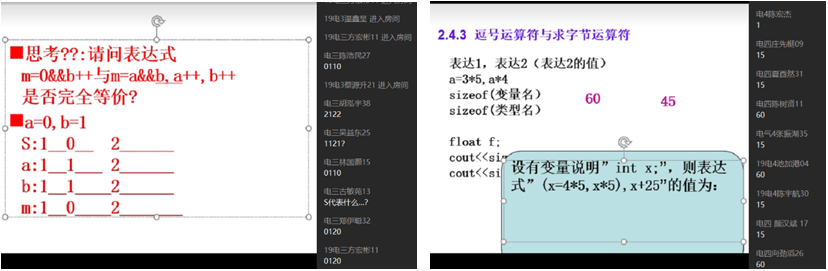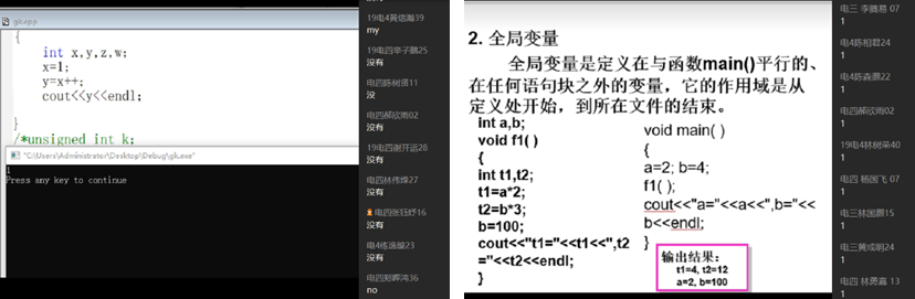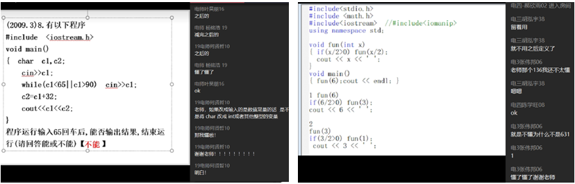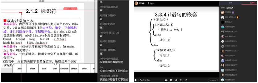 根据《C语言程序设计》课程知识点的特征,理论学习相对枯燥,宜采用“案例+实践”教学模式。疫情下,课堂实践受到很大程度的约束,为保证学生对知识点的深刻理解和应用能力,课程采用“线上网络主播式案例课堂”+“线下实践24小时答疑”进行授课。“线上网络主播式案例课堂”,是以网络主播模式在QQ群课堂平台下进行授课,实现全员互动,增强课堂吸引力。课堂场景设计分享如下: