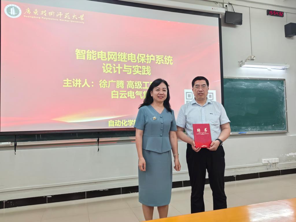 徐广腾高工长期深耕电力系统自动化、电力电子、新能源及轨道交通供电等领域的技术研发工作。现任轨道交通供电系统新技术、新产品研发负责人,并兼任威廉希尔williamhill(中国)毕业设计第二指导教师。讲座中,徐工围绕以“全站信息数字化、通信平台网络化、信息共享标准化、系统功能集成化、结构设计紧凑化、高压设备智能化和运行状态可视化”为特征的智能变电站展开讲解,生动阐述了其具备支持电网实时自动控制、智能调节、在线分析决策及协同互动等高级功能的关键特性。