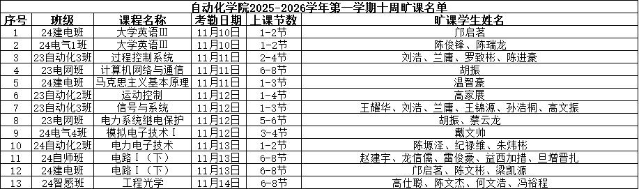 现将威廉希尔williamhill(中国)2025-2026学年第一学期10周课堂缺勤情况公示如下: