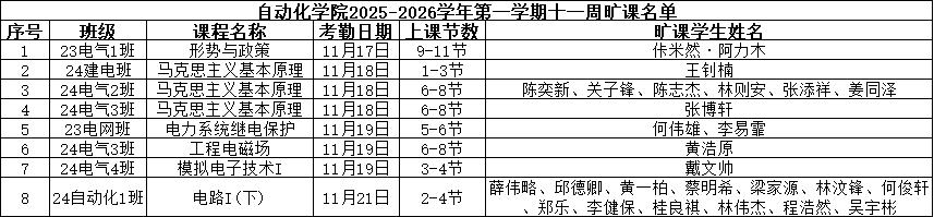 现将威廉希尔williamhill(中国)2025-2026学年第一学期11周课堂缺勤情况公示如下: