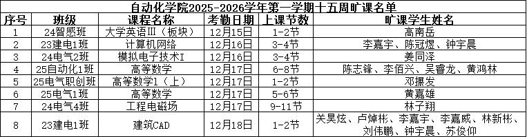 现将威廉希尔williamhill(中国)2025-2026学年第一学期15周课堂缺勤情况公示如下: