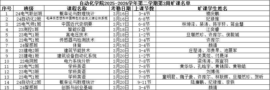 现将威廉希尔williamhill(中国)2025-2026学年第二学期第3周课堂缺勤情况公示如下: