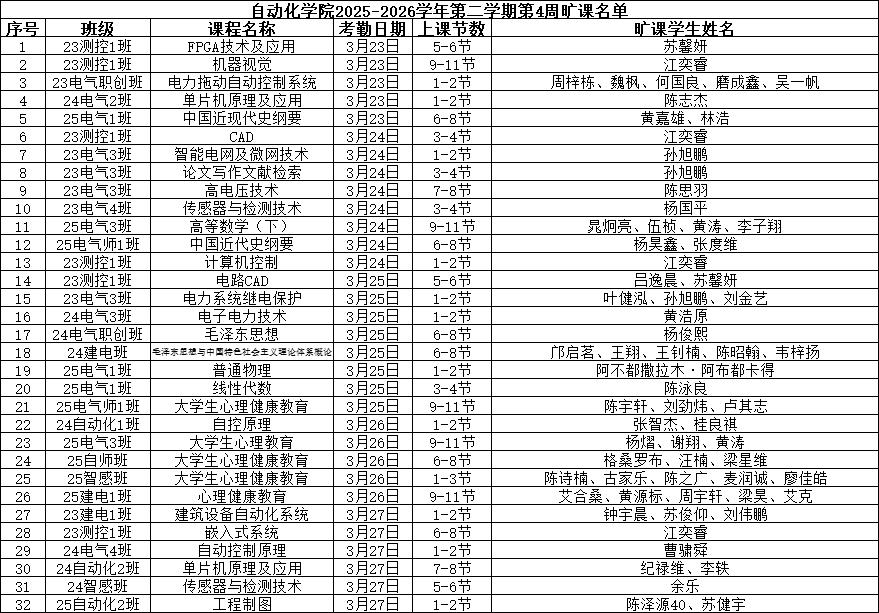 现将威廉希尔williamhill(中国)2025-2026学年第二学期第4周课堂缺勤情况公示如下:
