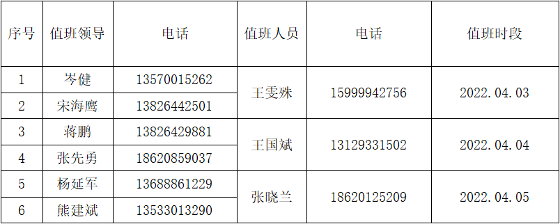2022年清明节假期值班表