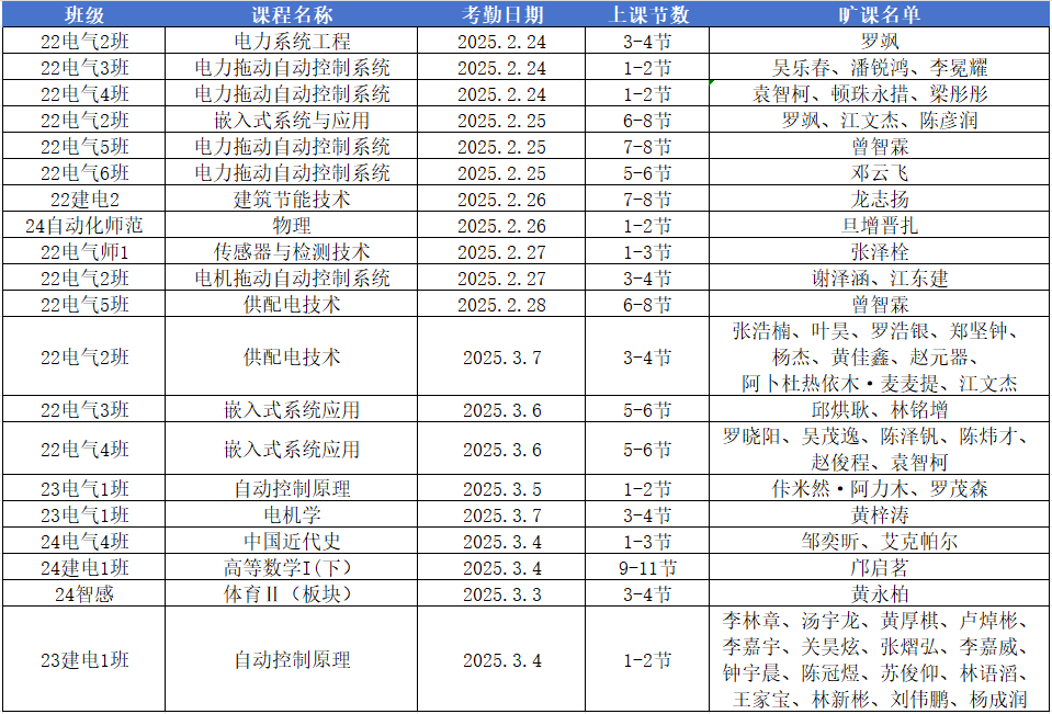 现将威廉希尔williamhill(中国)2024-2025学年第二学期1-2周课堂缺勤情况公示如下: