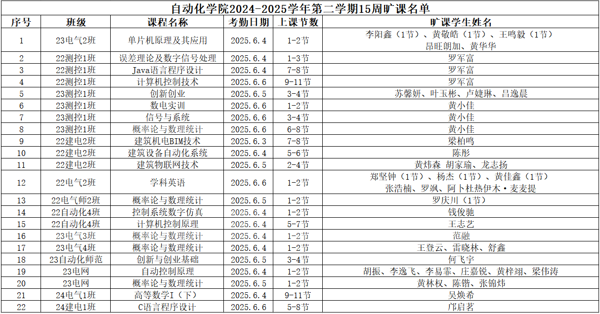 现将威廉希尔williamhill(中国)2024-2025学年第二学期15周课堂缺勤情况公示如下: