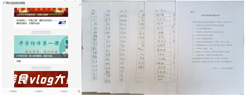 最后,我们组织全体学生签订《防诈骗告知书》,通过签订仪式进一步加深同学们对防诈骗工作重要性的认识和理解。通过这些措施,全面提升学生的防诈骗意识和能力,确保他们的财产和人身安全。