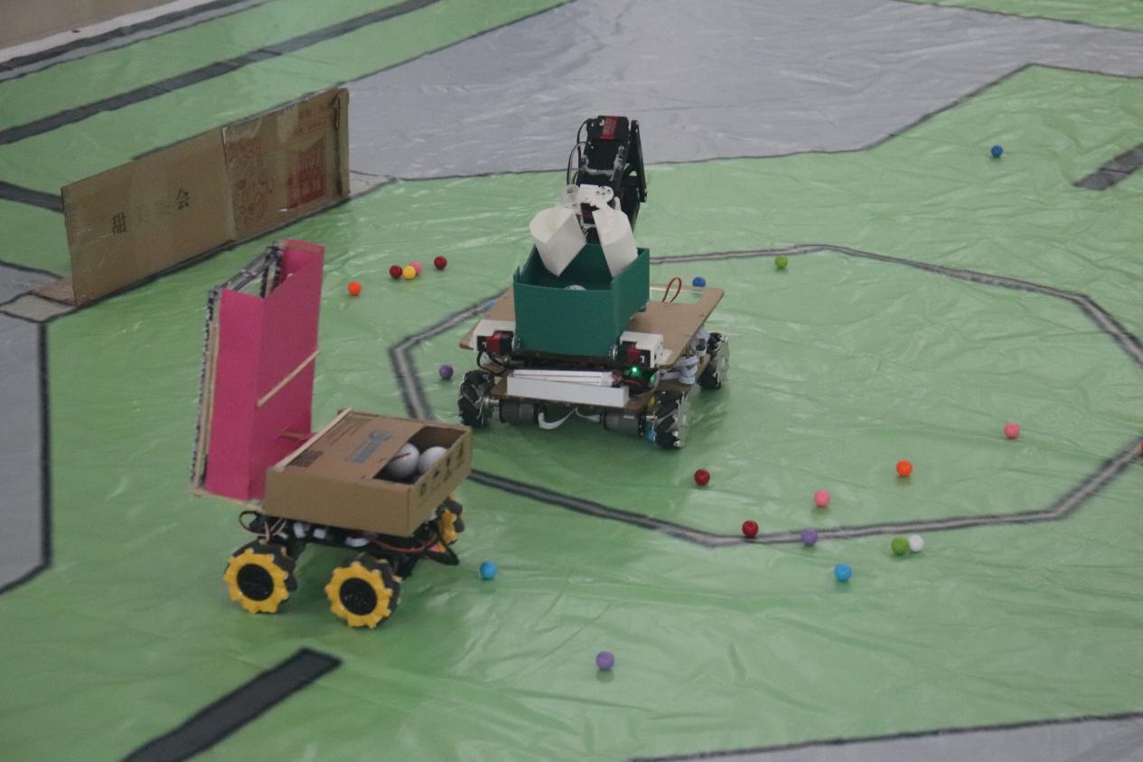 各参赛队伍在赛场上展示了精心设计制作的机器人,充分展现了团队实力和协作精神。比赛吸引了众多来自不同学院的学生到场观赛,现场气氛热烈非凡。比赛现场,参赛队伍通过抽签确定对战顺序,两两进行对抗。选手们通过控制上场的机器人沿规定轨道行进,在场地上收集小球并投入兑换区内以获得积分,同时,双方机器人展开激烈对抗以获取竞争优势,最终排名按照参赛队伍获得的总积分确定。在颁奖环节中,三支队伍依次上前接受荣誉表彰并领取奖品。毛泽文对参赛队伍的表现给予了高度评价,充分肯定了他们认真备赛、勇于挑战的竞赛精神。他热情号召全体同学积极参与学校各项活动,为学校科技创新事业的高质量发展贡献青春力量。