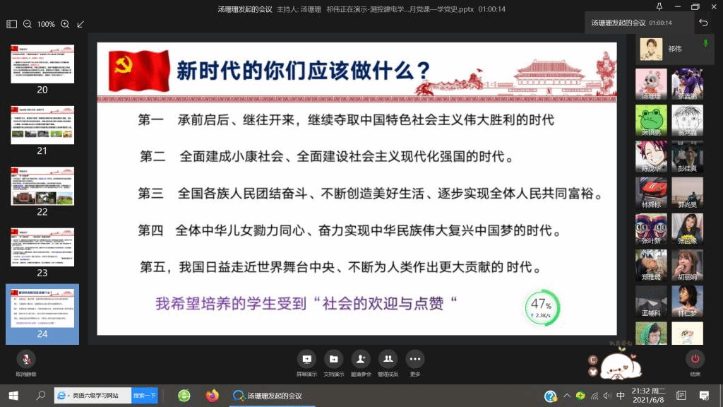 为加强党支部全体党员和入党积极分子们对中国共产党发展历程的认识和了解,2021年6月8日晚上20:30,测控与建电专业学生党支部挂钩党委委员祁伟老师通过线上直播授课方式,以“学史明理,学史力行”为主题,为测控与建电专业学生党支部全体党员和入党积极分子们上了一堂深刻而有意义的党课。