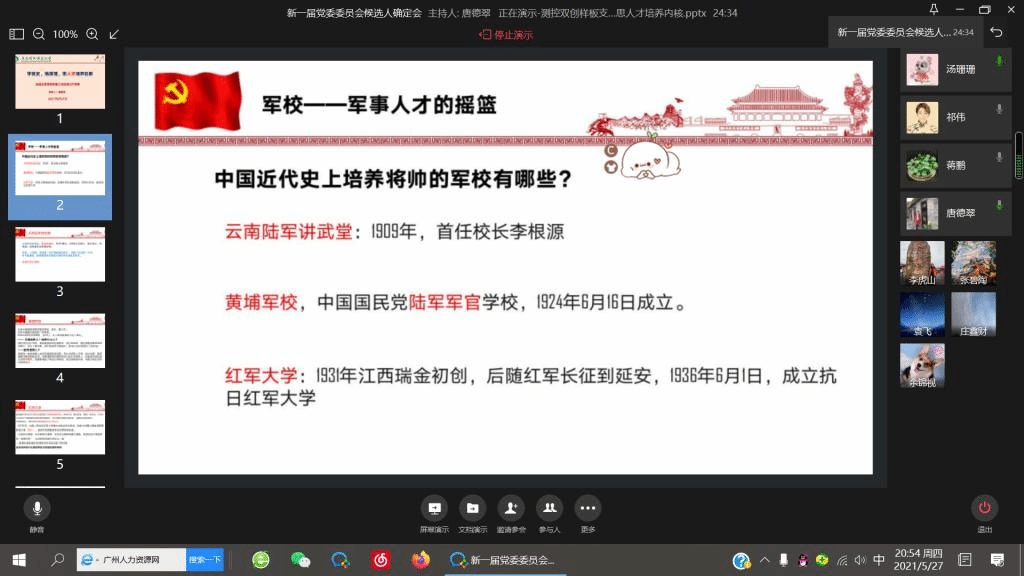 会议伊始,测控教工党支部书记唐德翠老师通过设置问题“大家知道我国近代史上著名的军事院校有哪些”为党课拉开序幕,祁伟教授回答黄埔军校、蒋鹏副书记回答云南陆军军官学校,党课在讨论和思考中徐徐展开。唐书记首先分享了她近期看到的凤凰卫视纪录片《军校育英才》的主要内容,然后为大家图文并茂讲解中国近代史上培养将帅的军校:云南陆军讲武堂、黄埔军校、红军大学。从各个军校的成立时间、培养人才特点及理念等角度一一展开,讲到云南陆军讲武堂这所最早的军校熔炉时,还给大家讲解了朱德元帅为了求学而将朱建德改名为朱德的小故事。重点讲解了黄埔军校和红军大学根据时局对人才需求来制定招生政策、授课内容和授课方式,从根本上回答了为谁培养人、培养什么人和如何培养人的三个问题。