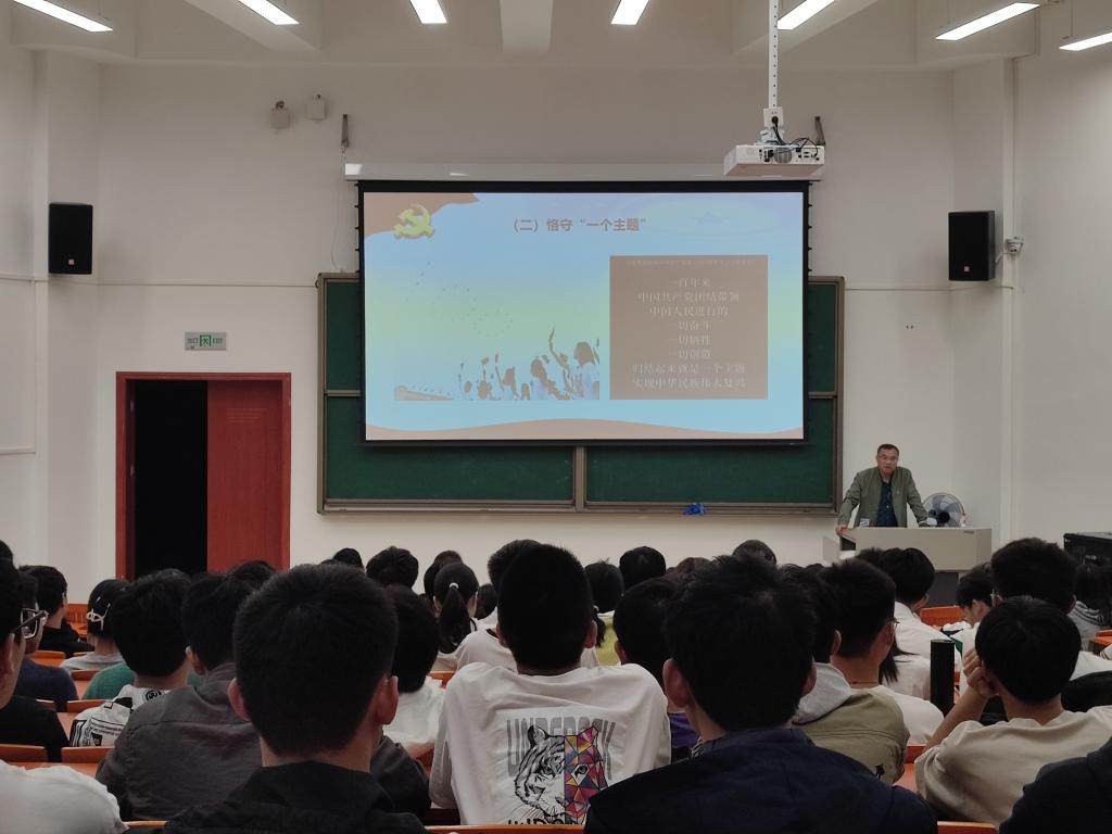 蒋鹏以“坚定理想信念,做时代有为青年”为题,梳理了中国共产党百年来的光辉历程,通过例子诠释了中国共产党的伟大建党精神,让21级新生在入学初期对百年党史有深刻的印象,强调了中华民族伟大复兴的“九个必须”,最后寄语广大青年学子要以实现中华民族伟大复兴为己任,增强做中国人的志气、骨气、底气,不负时代,不负韶华,不负党和人民的殷切期望。