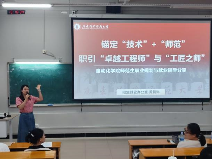 分享会伊始,黄曼琳老师紧扣我校“技术+师范”的办学定位,重点解读了电气专业和自动化专业职教师资的培养方向,并结合国家政策和专业特点,深入浅出地分析了当前的就业方向和前景,为同学们制定职业目标指明了方向。最后扩展到职业技能的具体培养路径,为同学们上了生动的一堂分享课。