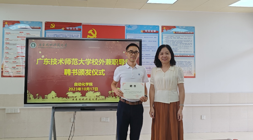 会上,岑健为周凉凉等人颁发广东技术师范大学校外兼职导师聘书,双方还就如何加强专业建设、产教融合项目、智慧校园、毕业生实习交流、管理制度与机制等进行了深入的交流与探讨,在进一步加强双方人才培养、实习实践、产教融合等方面的达成合作意向。